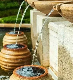 可以根據(jù)別墅庭院的風(fēng)格與需求,按照不同水的運(yùn)動形態(tài),例如平靜水、跌落水、噴涌水、流動水,進(jìn)行水景動靜結(jié)合的設(shè)計(jì),合理布置水池、噴泉、疊水等。