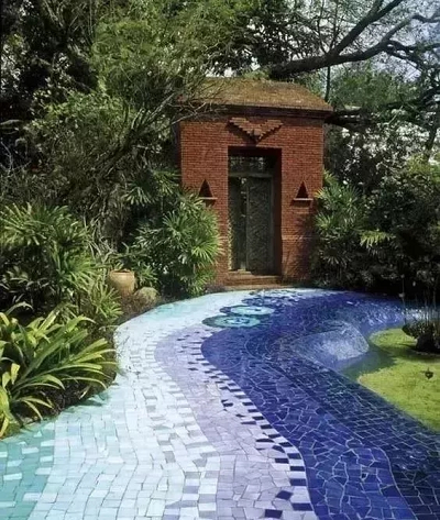 用馬賽克鋪地跟花磚一樣很驚艷,色彩鮮艷、個性突出,適合用在各種異域風格的景觀空間中。運用原則與花磚一樣—控制尺寸面積,不宜過大,適合點綴。