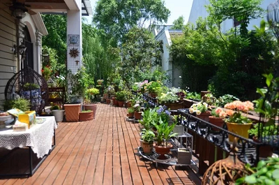 對(duì)無(wú)法管理花園的人,也可以嘗試容器栽培,用絢麗的盆栽配合天然質(zhì)地的室外家具,不僅節(jié)省空間,也易于打理。盆栽便于擺放和更換,所以特別適合缺乏種植經(jīng)驗(yàn)或沒(méi)有時(shí)間打理、照料植物的家庭。