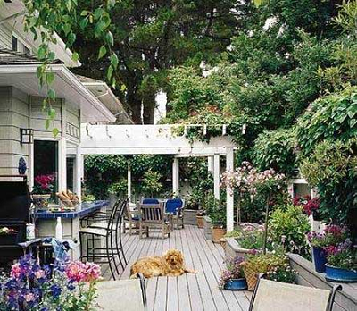 籬笆和藤架為植物提供了攀爬空間,更是營造出私密氛圍。花槽自然地將庭院分隔成三個區(qū)域,更是花園中美麗的點綴。