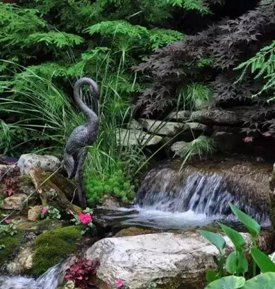 別墅綠化水景設計作為庭院景觀的一部分,按古代造園中常說“園以水活”,可以根據庭院的風格與需求,按照不同水的運動形態(tài),例如平靜水、跌落水、噴涌水、流動水,進行水景動靜結合的設計,合理布置水池、噴泉、疊水等。