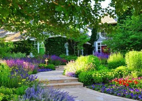 別墅庭園色彩也是影響庭園風(fēng)格的因素之一,對(duì)色彩規(guī)劃的一個(gè)技巧是根據(jù)建筑色彩與周?chē)h(huán)境確定庭園的主色調(diào)。觀葉植物在花園的設(shè)計(jì)中很重要,在英國(guó)等歐洲國(guó)家,認(rèn)為花壇中栽種些觀葉植物是很自然的事情。綠色中嵌有白斑的斑葉植物比純綠色種類(lèi)明度高,如銀葉的雪葉蓮、朝霧蒿草等,可將花壇襯托得更明亮,其他另栽具有橙色、紅色及紫色葉的彩葉植物,可形成強(qiáng)烈的對(duì)比,增加色調(diào)的明快感。此外還可考慮還有葉形的變化、質(zhì)感的差異等。