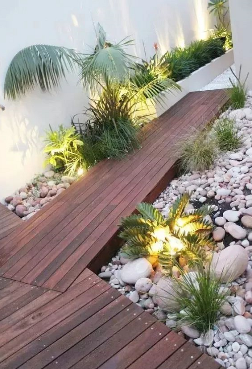 礫石,在鄉(xiāng)村庭院和日式庭院中很常見(jiàn),它是松動(dòng)的,踩在腳下很舒服,排水性也比其他地面強(qiáng)。礫石鋪地有助于防止土壤流失,讓水乖乖的滲透到地下,而不是沖刷走。