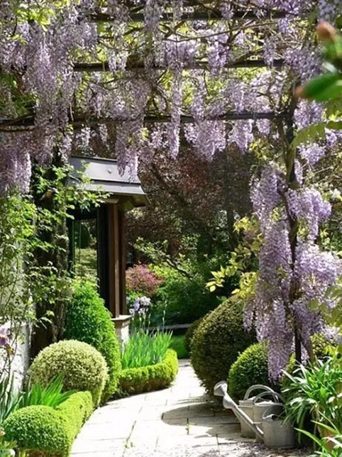 姿態(tài)古樸,干莖虬曲纏繞,葉密蔭濃。在花園中可植于臨水花架、柱廊、門庭兩旁;春季紫花爛漫,別有情趣;不過紫藤是落葉的,但花很漂亮。紫藤壽命長,管理粗放,只要保證充足的陽光,水肥適當,可保年年花繁葉茂(落葉植物)。