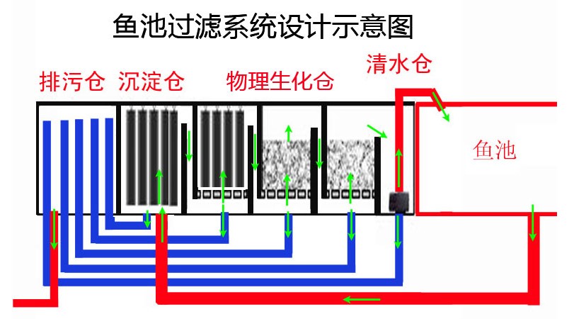 如下圖所示魚(yú)池過(guò)濾系統(tǒng)設(shè)計(jì)圖: