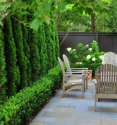 最后就是在視線觸及范圍種植灌木(如:金銀木、丁香、天目瓊花等)和綠籬(如竹子、北海道黃楊等)。具備了以上的三個層次,就可以打造出一個私密的花園空間。