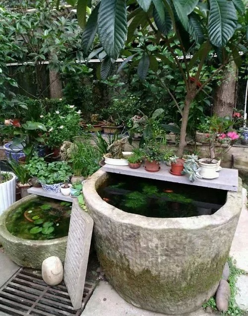 石缸養(yǎng)蓮植蒲,石磨鋪地做水景等等,