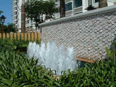 2.如果空地較多或者靠近原有河道可以考慮帶狀水景。在房屋的左右,圍墻的附近設計一條首末靠近的環(huán)形小溪,只在溪末泵水送向溪首,其余讓其在各景點自流充氧,形成豐富多樣的水姿.例如在溪首有個噴泉,自溪末取水就可達泵送的目的.像廣州這樣水源豐富,地下水位高的地方,盡可能做到底駁生態(tài),自凈。一二個噴泉水泵也負擔較輕.甚至可用玩具水車.景觀風車代替動力.