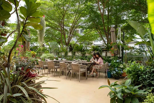 這個屋頂花園兩側(cè)被南海意庫建筑外立面郁郁蔥蔥的綠植包裹著,當(dāng)中草木繁茂、綠樹成蔭,成了一處靜謐、愜意、生機(jī)勃勃的小空間。整個花園分為精致賞花區(qū)、中心就餐區(qū)和靜思區(qū)三個不同功能的區(qū)域,以滿足多樣化的使用需求。