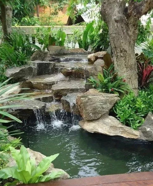 常見(jiàn)的有瀑布、水簾、疊水等。人工瀑布設(shè)計(jì)時(shí)要估計(jì)水量的大小,如果瀑身的水量不同,就會(huì)營(yíng)造出不同的氣勢(shì)。瀑布可分為面形和線形。不同的形式表達(dá)不同的感情。一般情況下,庭院中場(chǎng)地很小時(shí)很難規(guī)劃出氣勢(shì)恢宏的景觀。因此庭院中可多采用水簾、疊水或流水墻等形式。